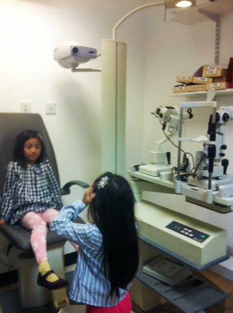 So we came back on wednesday, three days later to see the optometrist. When we were called in, our little miss clingy Iris also wanted to tag along so we took her in together with us to see Mr. Optometrist. Babah waited outside with adik Zafri. But luckily, this chatty girl can't stop talking so THAT made Along Zahin felt less nervous. Good job, Iris! Hehehe...